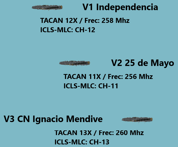 V2 25 de Mayo             :  TACAN 11X / Frec: 256 Mhz / ICLS-MLC: CH-11  (ATAQUE)