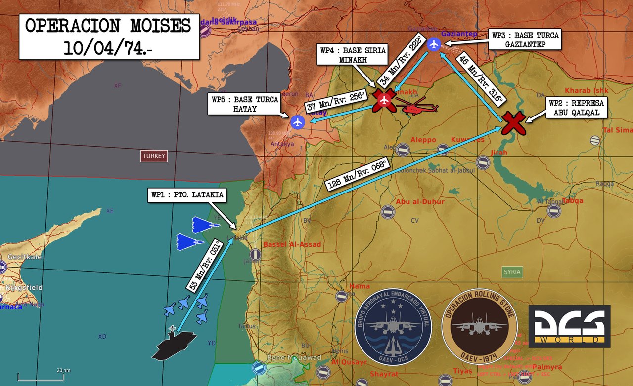 Despegarán de la FT y pondrán rumbo al Puerto de Latakia. (35º 30'N / 35º 46'E). Una vez alcanzado este WP orbitarán a 30 mil pies. El objetivo de Caza será el de interceptar y derribar cualquier PAC enemiga proveniente del sur de Siria. Cualquier otro contacto al norte de la latitud de LATAKIA será ignorado y dejado a criterio de la escuadrilla de Ataque.